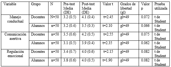 Los resultados pre y post-test muestran diferencias estadísticamente significativas en las tres dimensiones evaluadas tanto en docentes como en alumnos. En todos los casos, los valores de p fueron menores a 0.05, lo cual indica que la intervención tuvo un efecto positivo en las habilidades reportadas. Por ejemplo, los docentes mostraron mejoras en el manejo conductual (p=0.032), la comunicación asertiva (p=0.045) y la regulación emocional (p=0.028). Estos resultados permiten rechazar la hipótesis nula y apoyar la hipótesis alternativa.