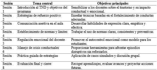 El programa de psicoeducación constó de 8 sesiones (una por semana), con una duración promedio de 90 minutos cada una. Las sesiones fueron diseñadas con un enfoque práctico, participativo y fundamentado en la evidencia, incorporando principios de disciplina positiva, refuerzo positivo, comunicación asertiva y regulación emocional. A continuación, se presenta un resumen de los temas tratados en cada sesión:
