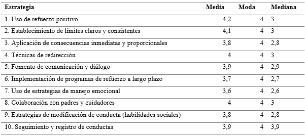 En promedio general las estrategias se sitúan en media entre 3.6 y 4.2 en promedio lo cual indica que los docentes valoran ampliamente las técnicas basadas en el refuerzo positivo, limites definidos y claros y sobre todo dimensionan la comunicación afectiva como alcance asertivo. La moda se tuvo un valor uniforme de (4) lo cual sugiere que estas prácticas son más aceptadas y con respuesta positiva en el ámbito escolar.