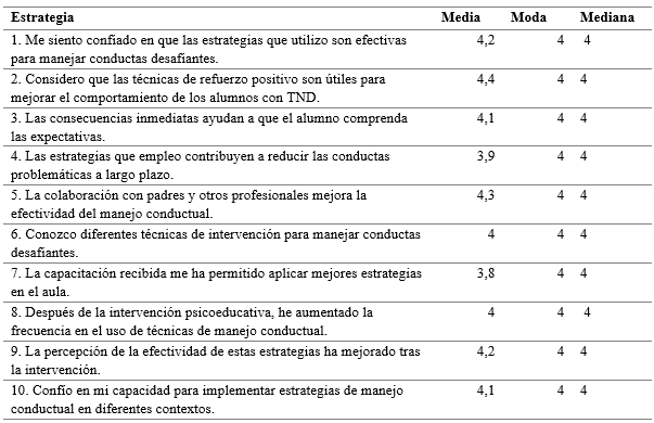 Esto denota que en cuanto al conocimiento y capacitación docente se tiene una media en rango (4) lo cual indica que los docentes poseen grandes conocimientos en técnicas de intervención y que la capacitación recibida ha mejorado con la práctica docente. La percepción positiva sobre el aumento en el uso de técnicas tras la intervención psicoeducativa (Media=4.0) y la percepción de mayor efectividad tras estas intervenciones (Media=4.2) sugieren que los programas de formación y apoyo están teniendo un impacto favorable en la implementación de estrategias.
