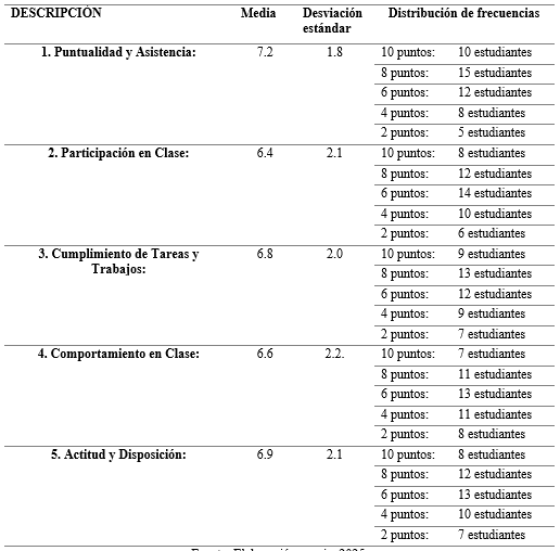 La puntuación media en esta sección es de 7.2, lo que indica que, en promedio, los estudiantes mantienen una buena frecuencia y puntualidad en sus asistencias. La desviación estándar de 1.8 sugiere una dispersión moderada en las respuestas, señalando que, aunque la mayoría de los estudiantes tienden a puntuar cerca de la media, existe cierta variabilidad. La distribución de frecuencias revela que la mayoría de los estudiantes se ubican en las puntuaciones de 8 y 10 puntos, con 15 y 10 estudiantes respectivamente, lo que indica una tendencia positiva en la puntualidad y asistencia. Sin embargo, un número menor de estudiantes obtiene puntuaciones bajas (2 y 4), sugiriendo que, aunque la mayoría cumple con la asistencia, aún hay alumnos con dificultades en esta área. La presencia de puntuaciones dispersas en ambos extremos refleja cierta heterogeneidad en el comportamiento de asistencia.