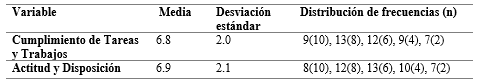 Las medias en cumplimiento de tareas (6.8) y actitud (6.9), acompañadas de desviaciones estándar de aproximadamente 2.0 y 2.1 respectivamente, reflejan que, en promedio, los docentes perciben un nivel moderado en ambas variables. La dispersión indica cierta variabilidad en las respuestas, sugiriendo que no todos los docentes tienen las mismas percepciones o experiencias respecto al cumplimiento y la actitud.