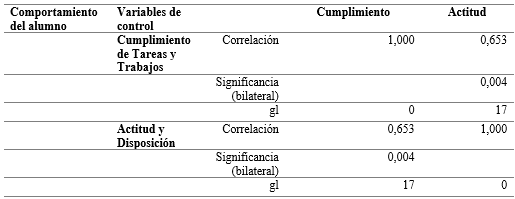 Tabla 7. Correlaciones variables entre el cumplimiento de los docentes y actitud de los alumnos