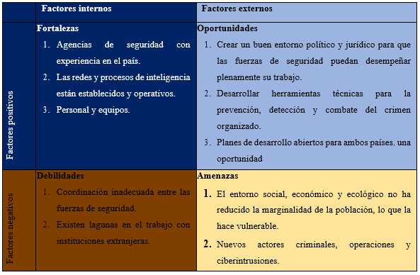 Con base en la información obtenida en los apartados anteriores, se propone la siguiente matriz FODA, que hace referencia principalmente a las actividades de inteligencia de la Policía a nivel de la provincia Esmeralda, pero también de otras estructuras de seguridad en la lucha contra el crimen organizado: